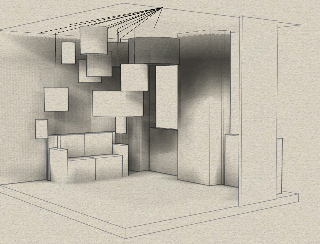 Un nombre important de suspensions de différentes hauteurs sont positionnées au plafond , ce qui amène une forte ambiance théâtrale à l’ensemble de la pièce.