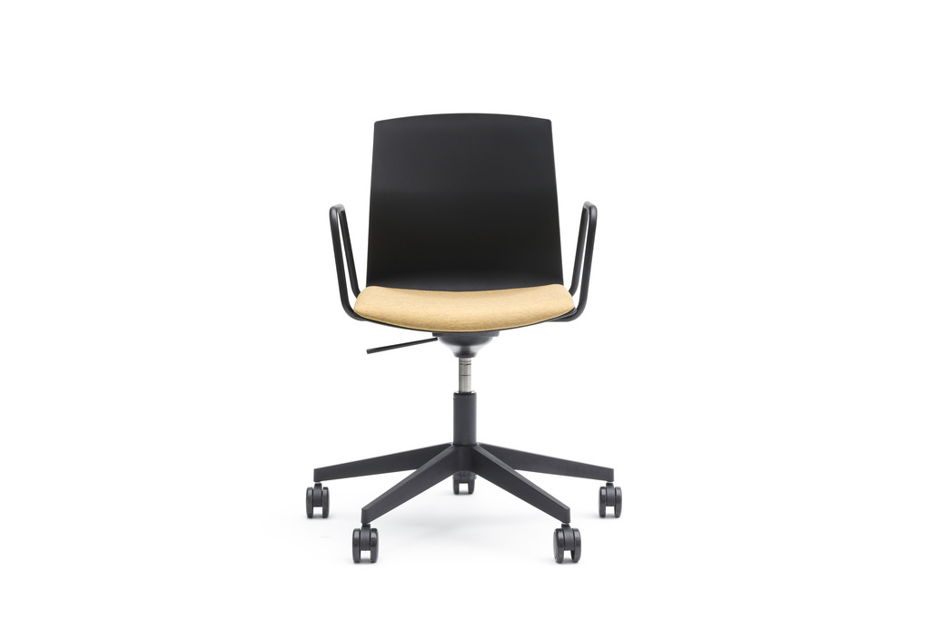 Chaise avec ou sans accoudoirs, idéal pour hôtellerie et les projets de bureau. Il existe des versions avec structure pivotant en aluminium ou en bois.