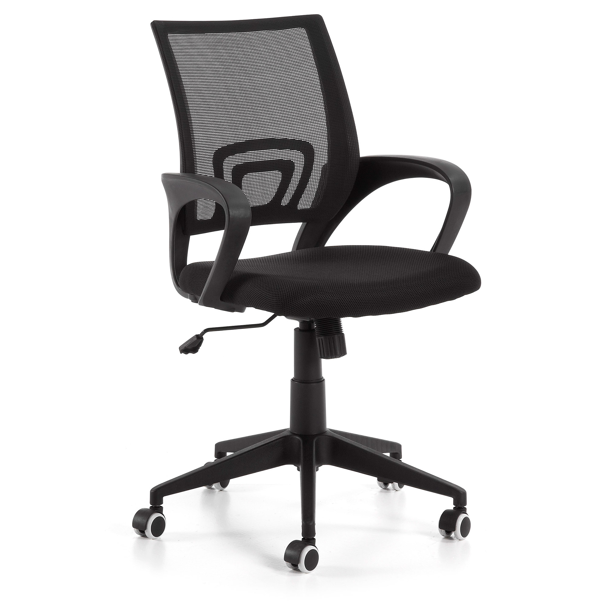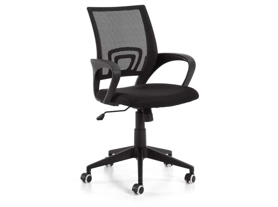 Chaise de bureau pivotante avec structure, accoudoirs et piétement en polypropylène injecté. Assise et dossier remboursé tissu maille filet. Système de levage par pompe à gas. Basculante. Roulettes en polyuréthane.