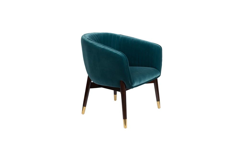 Fauteuil en velours bleu canard idéal pour l’acceuil d’un hôtel.