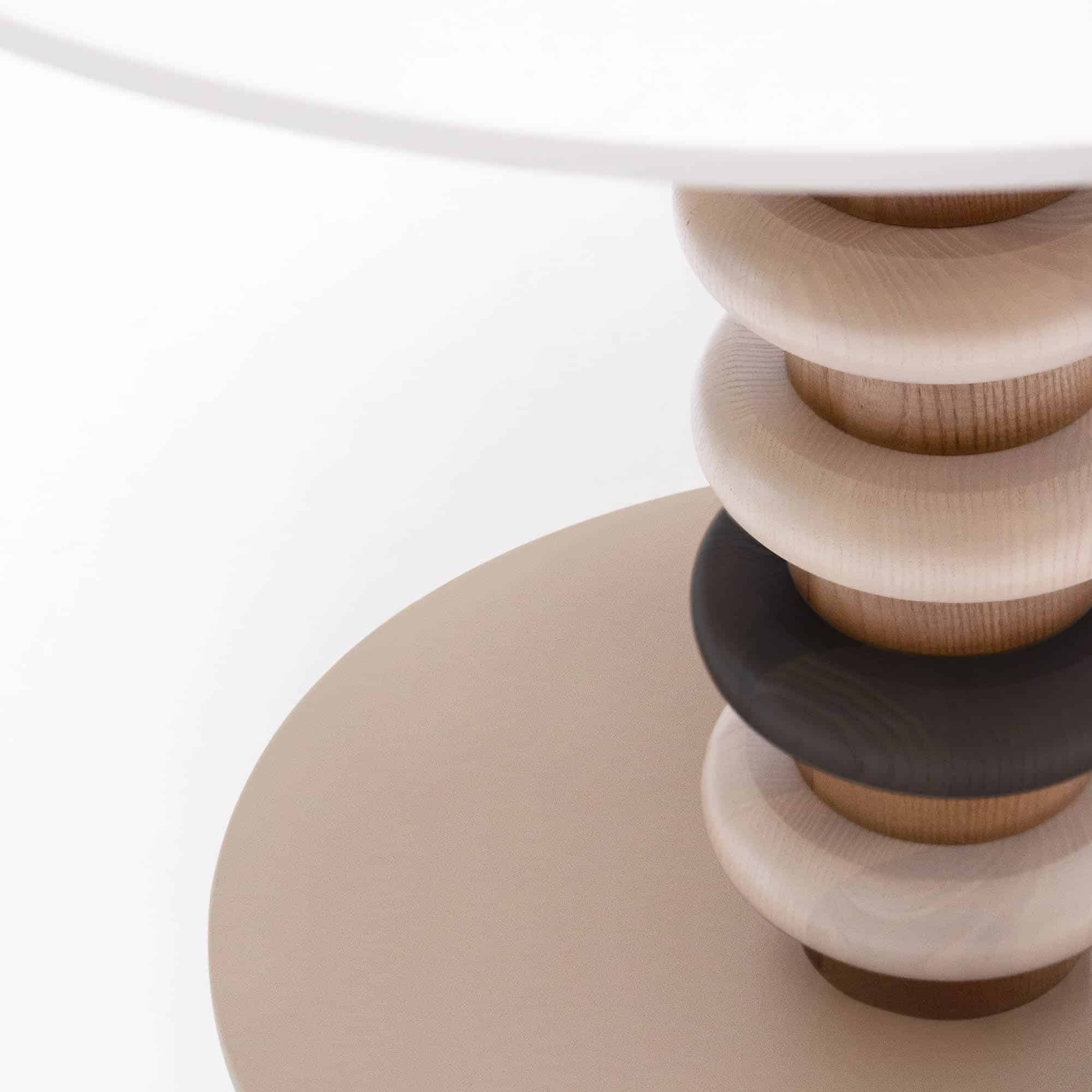 Le plateau peut être réalisé en bois massif de hêtre ou de chêne, en panneau de particules laminé, plaqué, teinté ou en grès cérame, selon vos préférences. La colonne centrale est en hêtre massif tourné, avec des finitions en teinture, et la base est en métal noir laqué au four, alliant solidité et élégance.