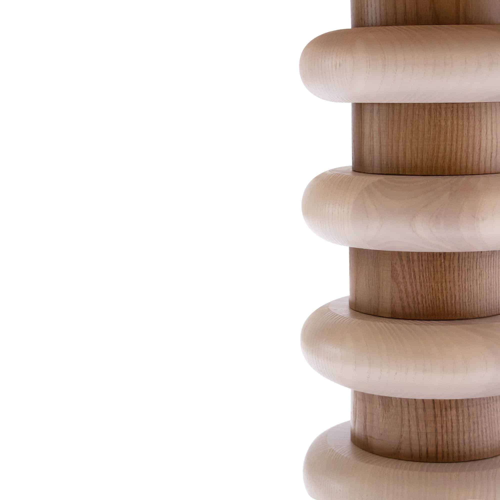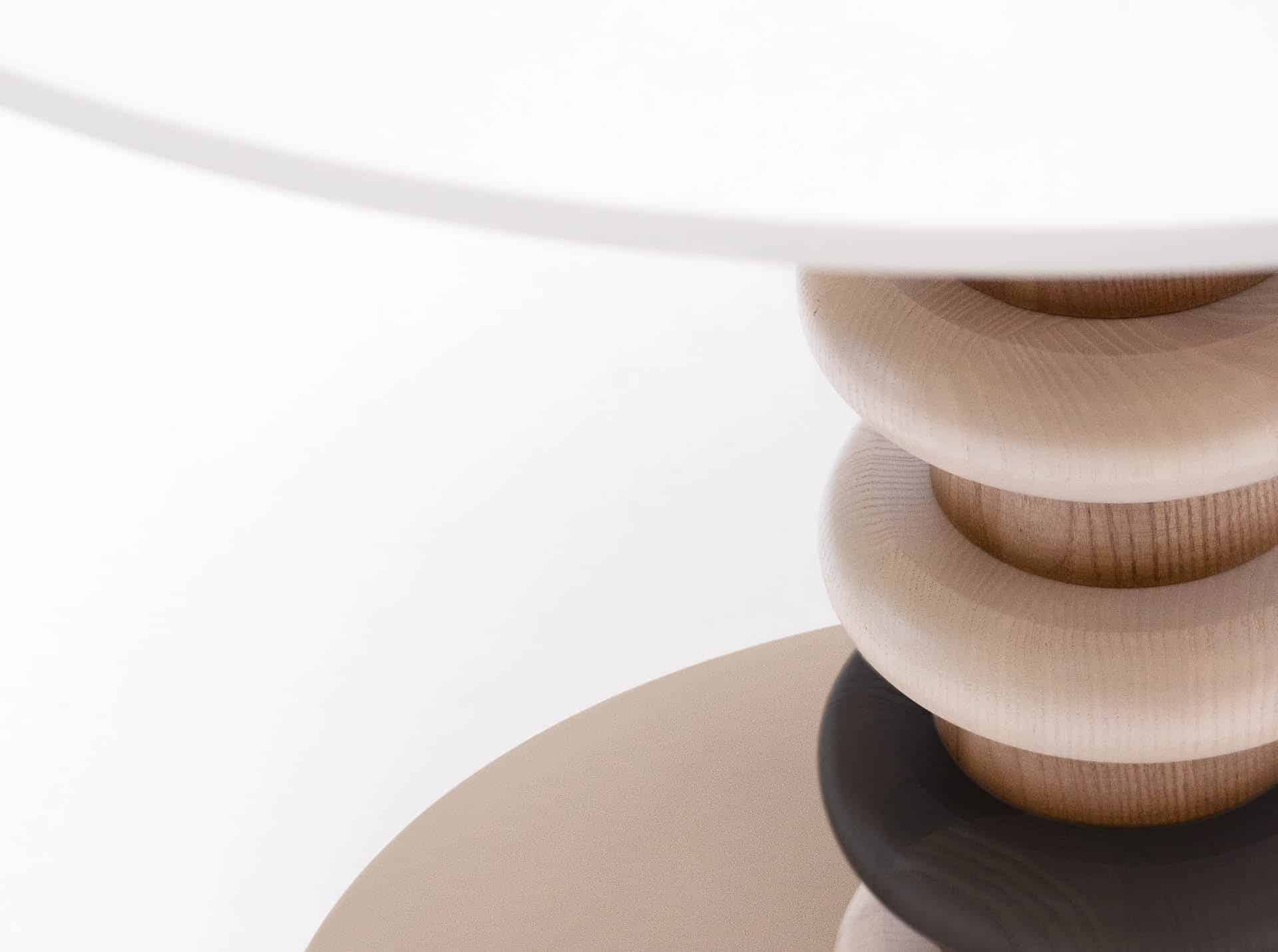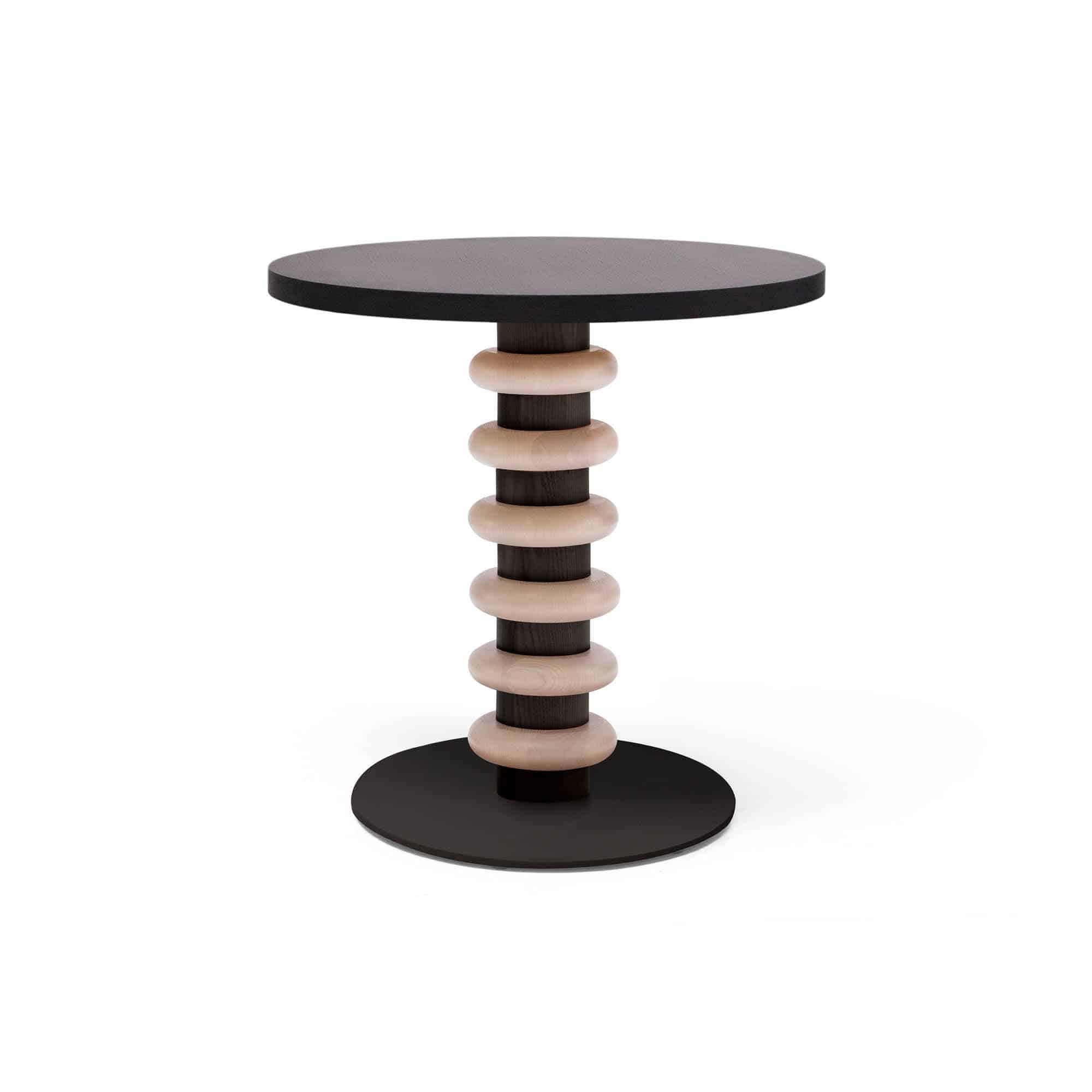 la table qui incarne le design organique. Le piètement de la table est orné d’anneaux en bois. Les cercles représentent la monotonie de la répétition, car le cercle est le symbole des cycles qui se répètent. Le mouton noir est las de la monotonie et a besoin de briser le cercle.Plateau en bois de hêtre/chêne massif, panneau de particules laminé ou plaqué en éco-bois ou grès cérame. Colonne en hêtre massif tourné. Finitions en teintures. Base en métal noir laqué au four.HT:65. Plateau :diam 60