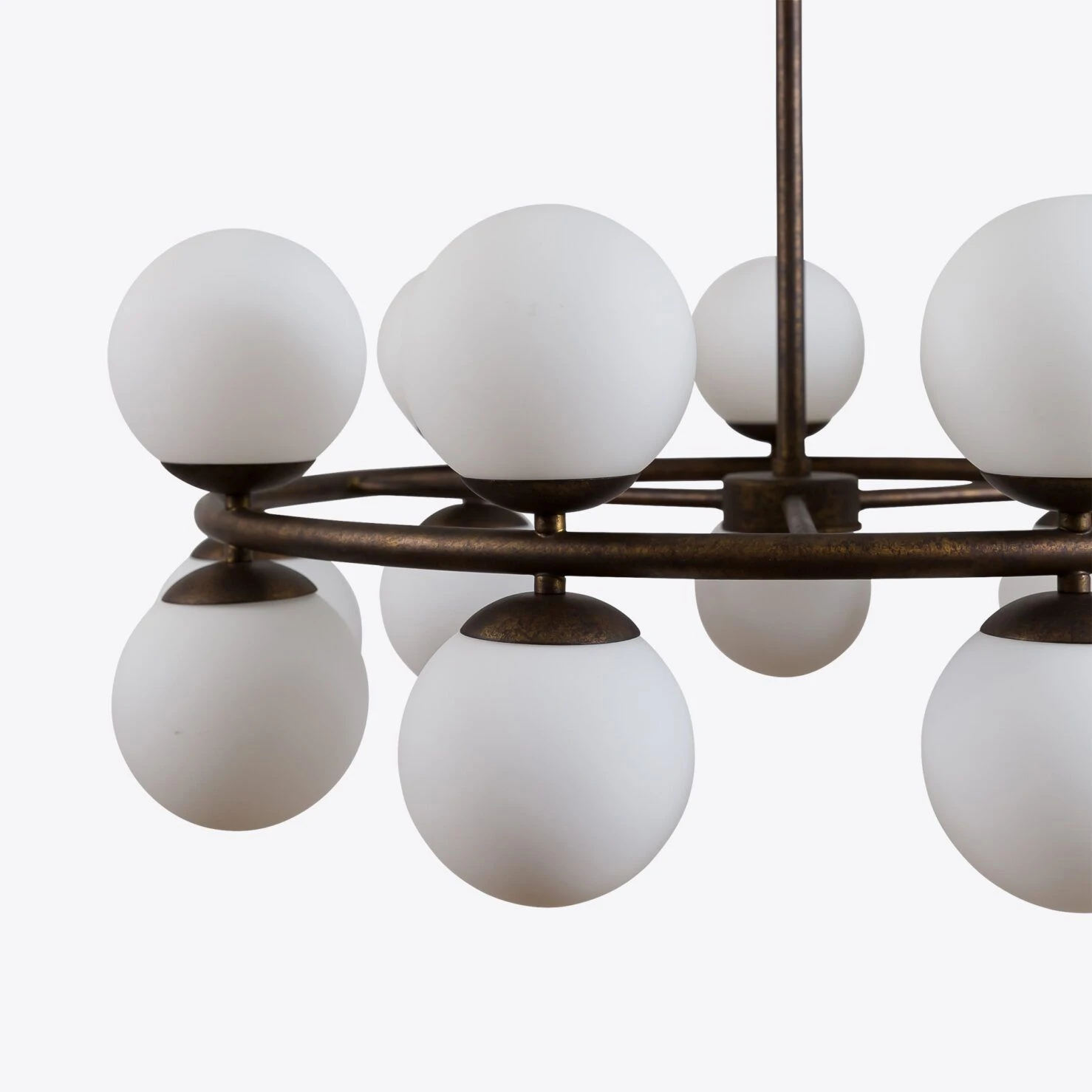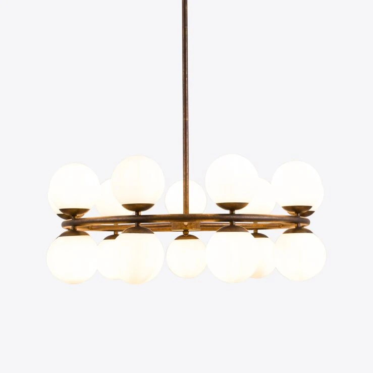 lustre circulaire saisissant, au style vintage, avec une finition laiton vieilli. Ce design aux proportions harmonieuses comprend un total de 18 abat-jours en verre opalin, disposés sur le dessus et le dessous de la structure circulaire. en verre opalin divisés, suspendus à une structure en laiton brossé, dans un style mid-century saisissant. Idéale pour les salons, salles à manger et même les espaces commerciaux.