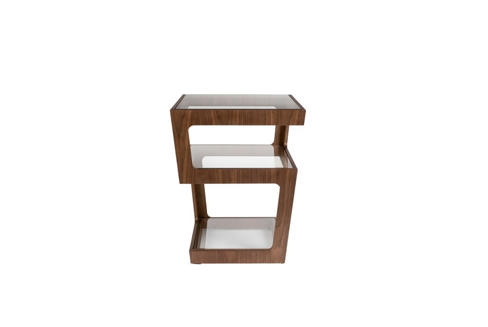 Petite table d’appoint ou table de nuit. Plateau de 5mm en MDF plaqué walnut. Dessus en verre.