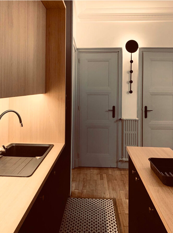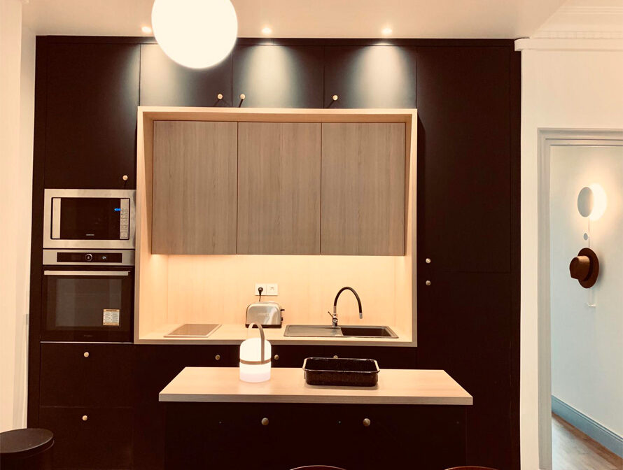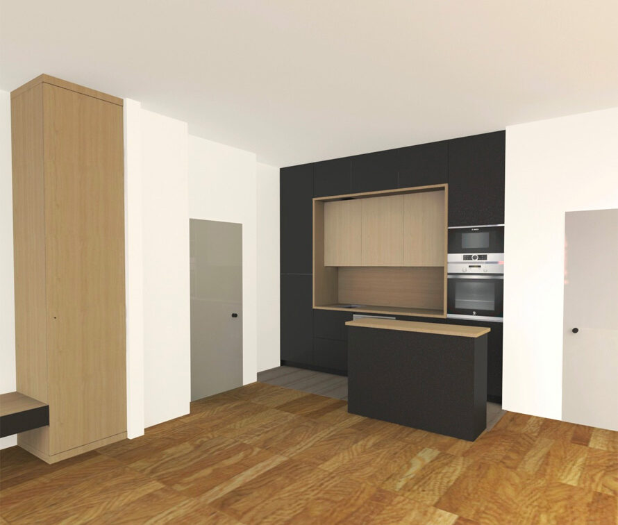 Il a conçu intégralement le mobilier de la cuisine fabriqué, livré , monté par une entreprise portugaise de mobilier. Les meubles sont en stratifié de chêne clair et de bois noir mat.