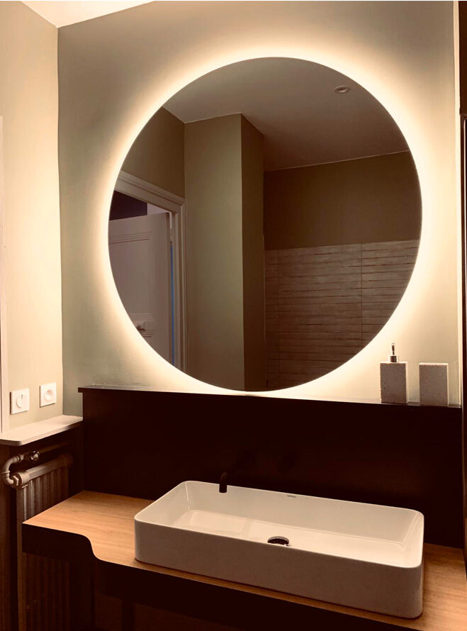 Dans chaque pièce ,il a crée des placards ainsi qu’un banc de décoration et des étagères illuminés de leds pour l’espace salon, amenant une ambiance feutrée.