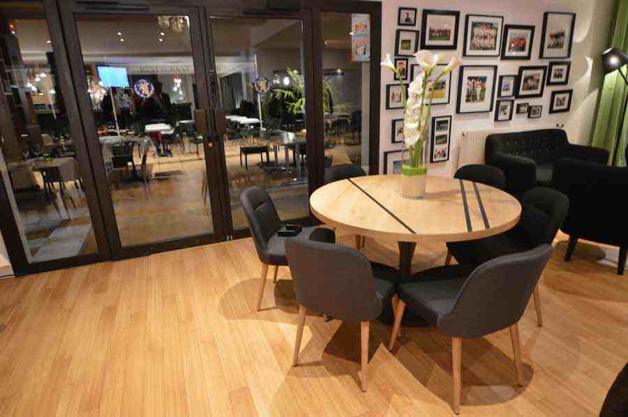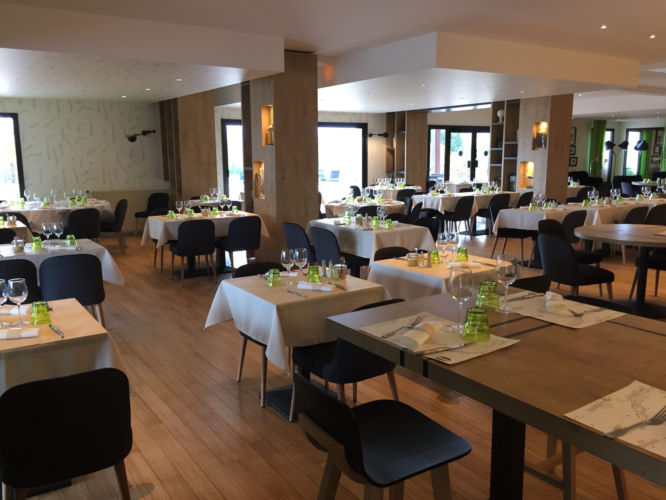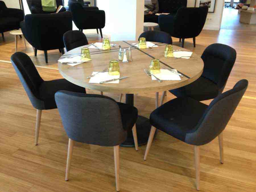 Lors de la rénovation du Golf club de la Tour de Salvagny, l’architecte m’a contacté pour trouver un mobilier correspondant au cahier des charges. Nous leur avons proposé un mobilier contemporain mais soft  correspondant à  la clientèle du Golf . Concernant les chaises , nous avons joué sur un bicolore dans le tissu :gris clair et gris foncé. Les chaises sont extrêmement confortables et de petites dimensions suivant leur demande .
